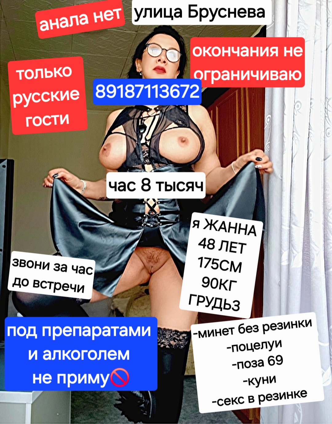 Роскошная, зрелая, знает своё дело на все 100%. Езжу только к ней!!!! Минет со стонами делает, заглатывает по самые гланды, любит это дело! Писюшка с причёской, пушистик, возбуждает нереально!!!! Обязательно буду посещать по мере возможности.